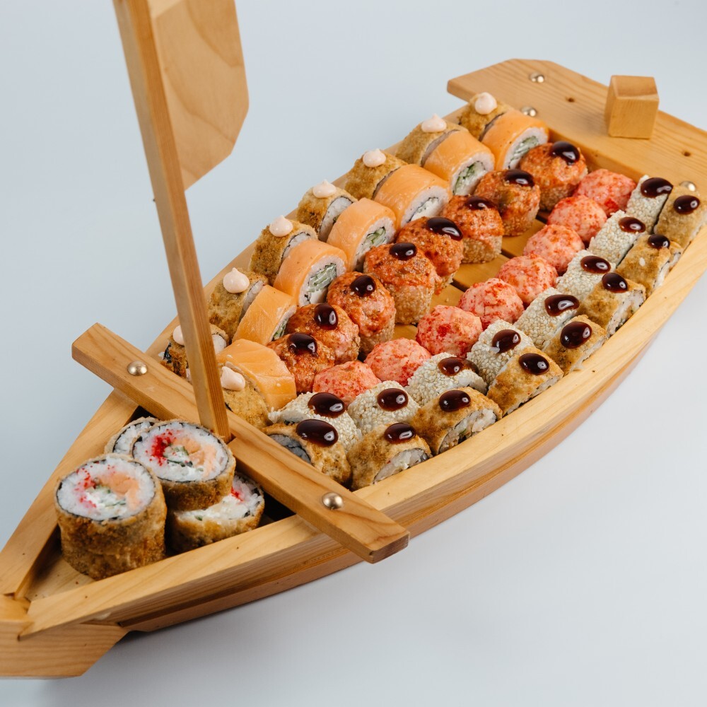 8шт. Филадельфия ролл 8шт Нежный угорь 8шт Темпура 8шт Банзай 5шт Дежавю 8шт Запеченный лосось 8шт Запеченный угорь 5шт.Соевых соусов 3шт.Имбиря 3шт.Васаби