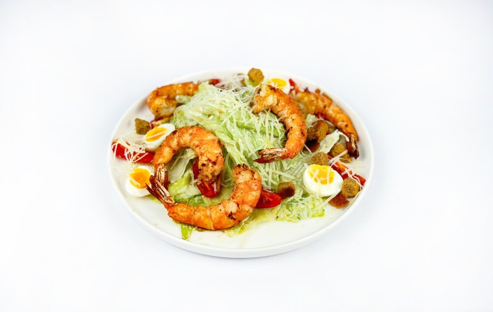 Салат айсберг, Креветки, Помидоры черри, Соус цезарь, Перепелиные яйца, Сухарики, Сыр пармезан.