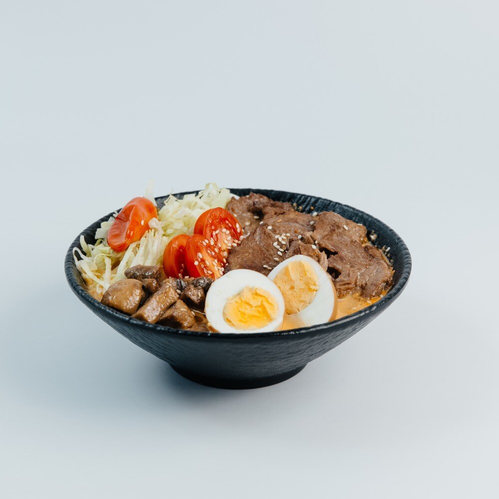 Пшеничная лапша, Яйцо куриное, Салат айсберг, Шампиньоны, помидоры черри, Говядина, Зеленый лук, Кунжут.