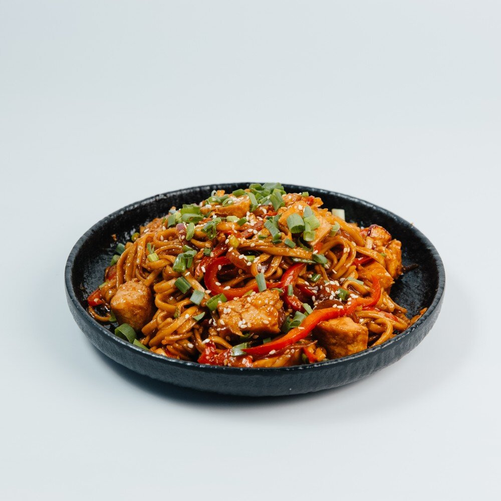 Лапша пшеничная, Болгарский перец, Соус сладкий чили, Соевый соус, Зеленый лук, Кунжут, Соус шрирача, Куриное филе.