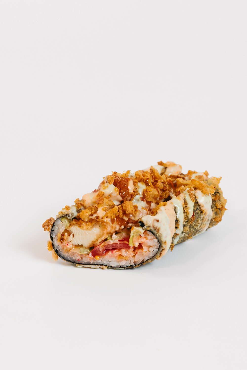 Рис SHINAKI, Нори, Спайси соус, Помидор, Айсберг, Куриное филе, Соус васаби, Жареный лук.
