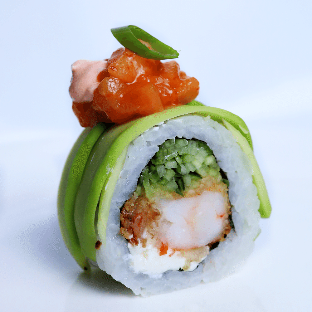 Рис SHINAKI, Нори, Творожный сыр, Креветка, Огурец, Лосось, Соус шрирача, Авокадо.