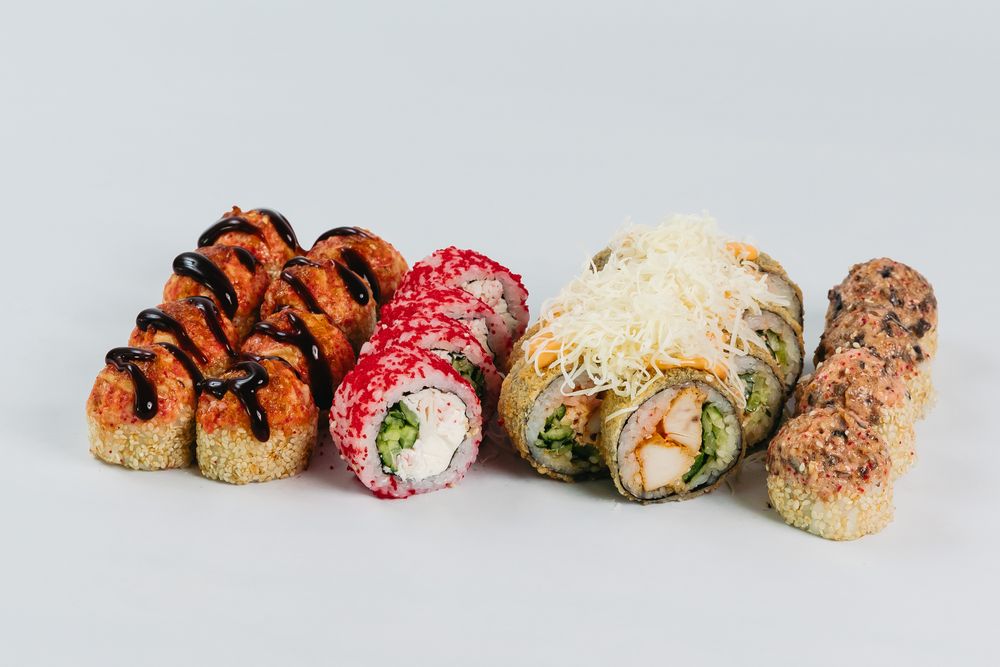 4шт. Спайси угорь 8шт. Запеченный угорь 8шт. Цезарь 4шт. Калифорния с крабом